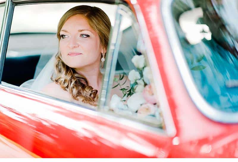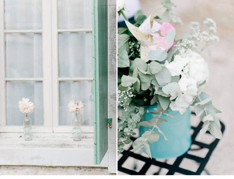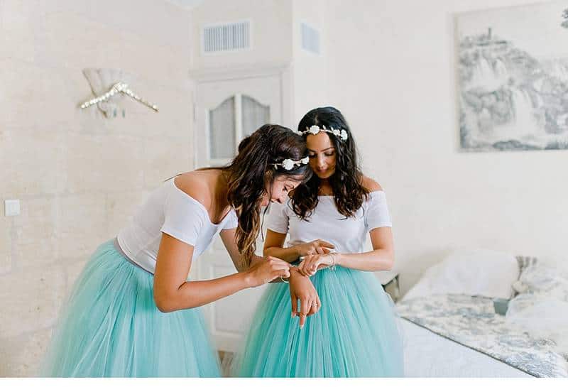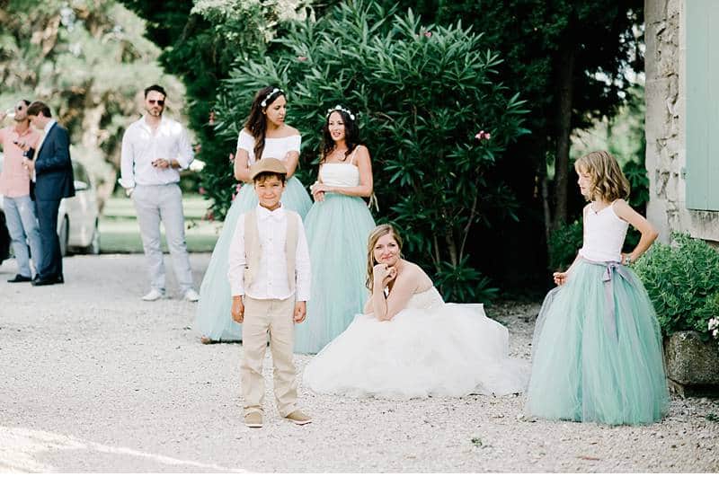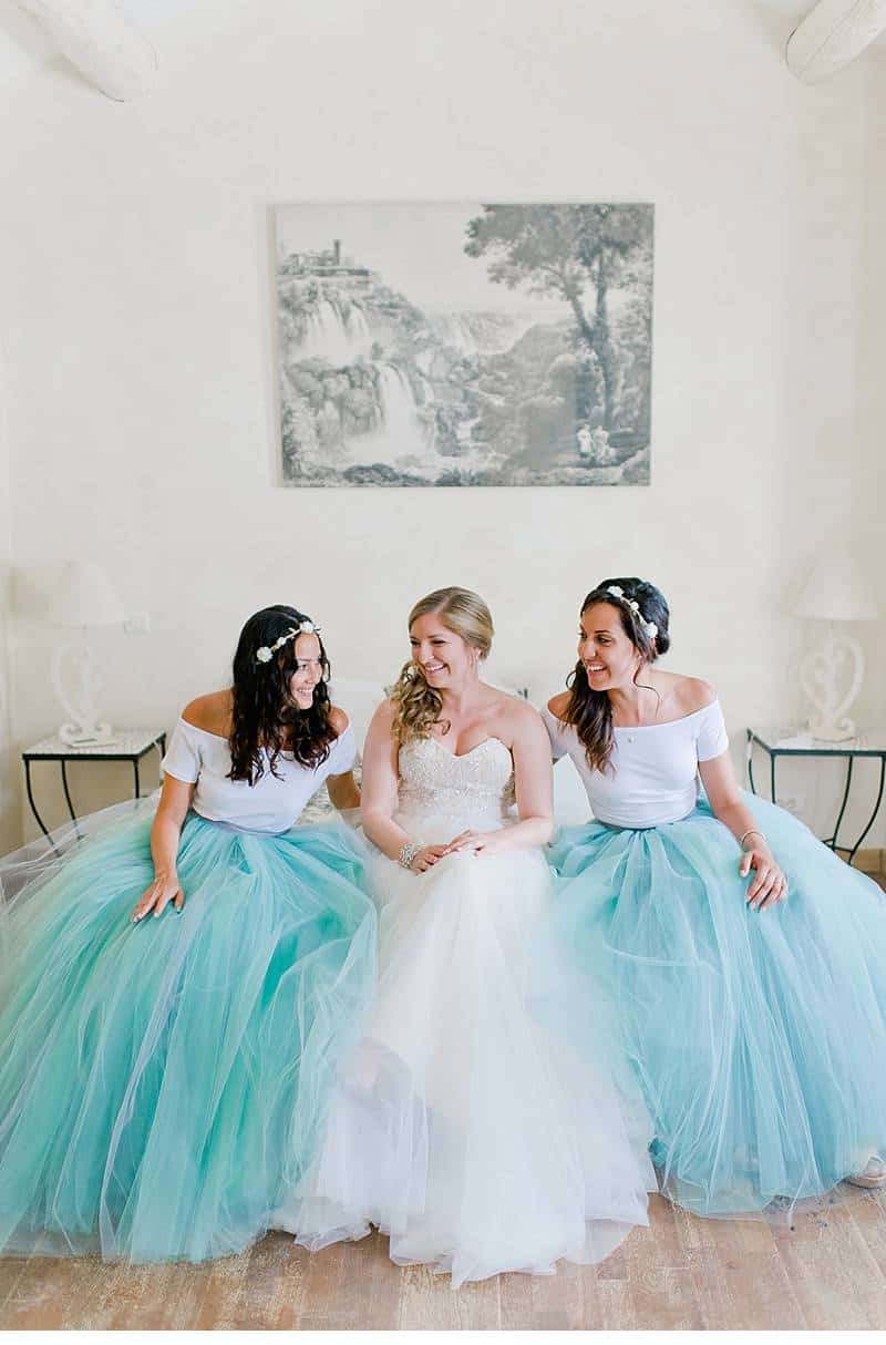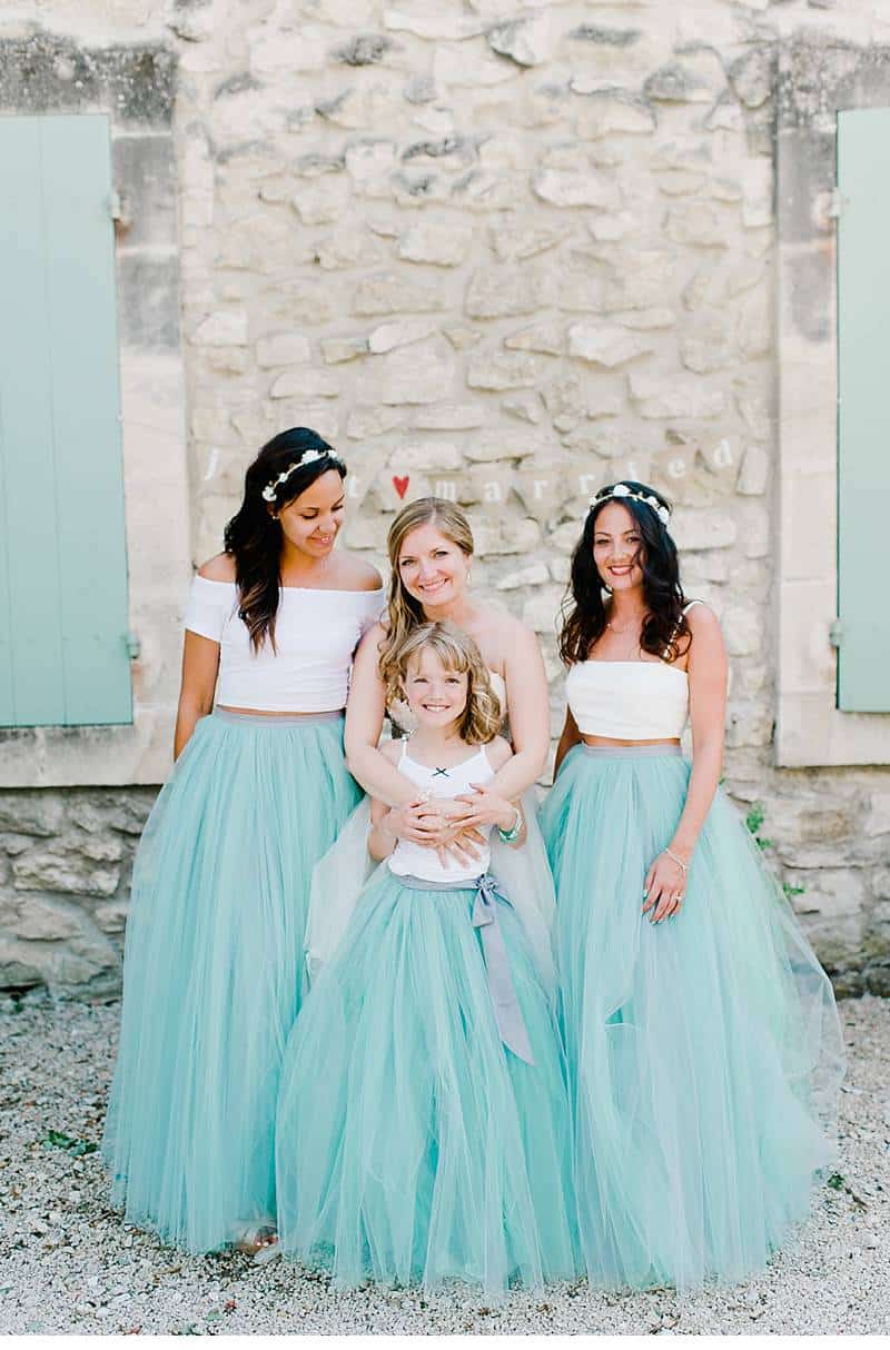The bridesmaids wear adorable floral wreaths in their hair and big, turquoise colored tulle-skirts. Gracefully the bride wears white, her bridal bouquet is made of amazingly pretty blossoms. The groom wears an extraordinary, blue suit perfectly matching her dress.