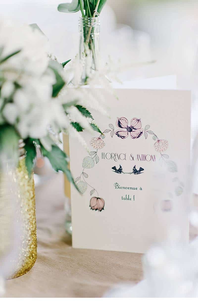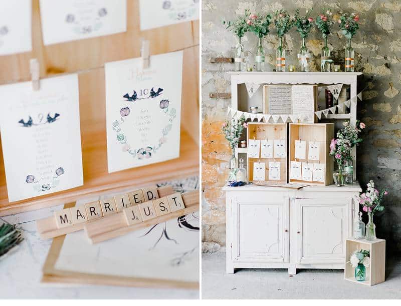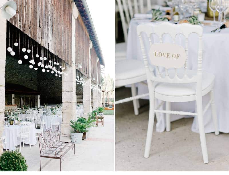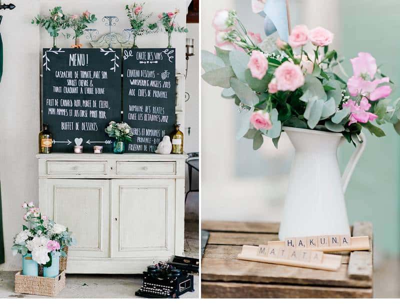 Little bottles with oil as favors for the guests stand next to each plate. In a great way they reflect the noble, dark colors of the table decoration. Cute nametags made of scrabble letters lead the guests to their seats. It´s one of the many perfect details that let this wedding at the Provence shine especially bright.